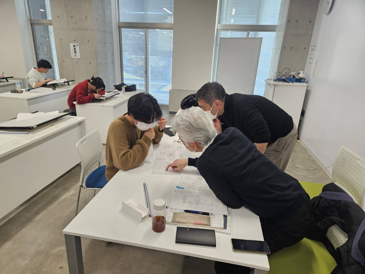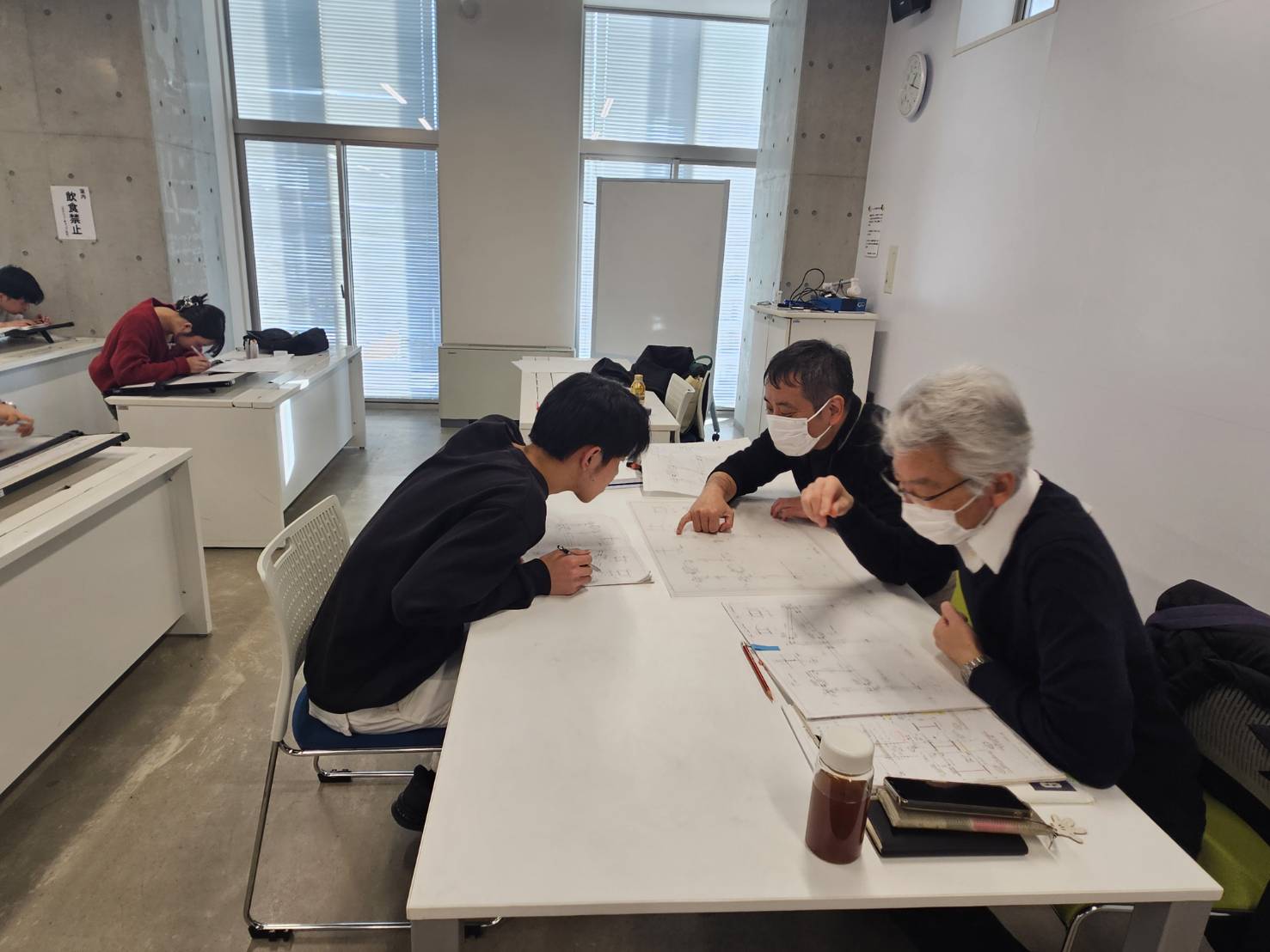 授業の中盤になると完成した図面のチェックを受ける学生が増えてきました。