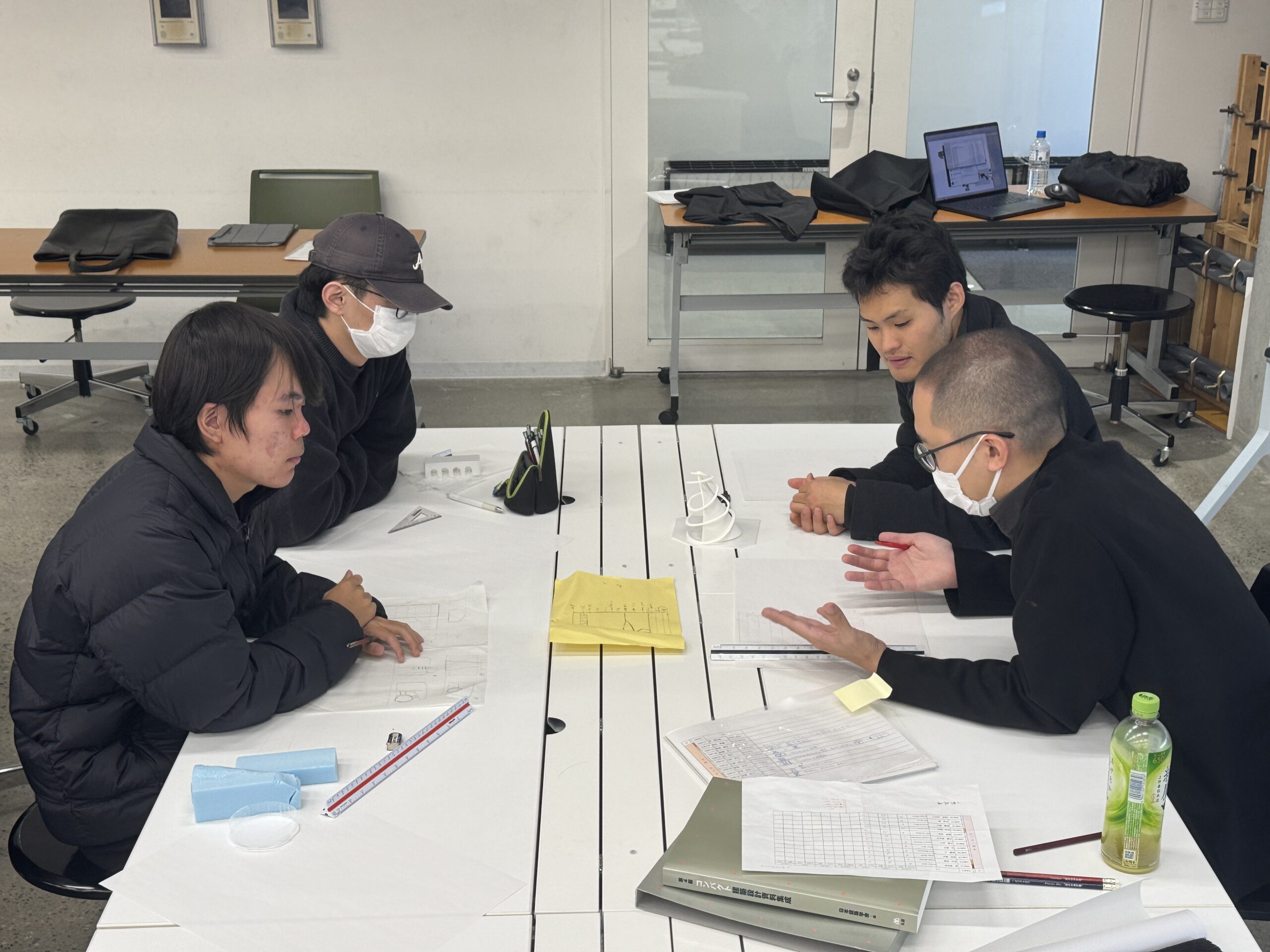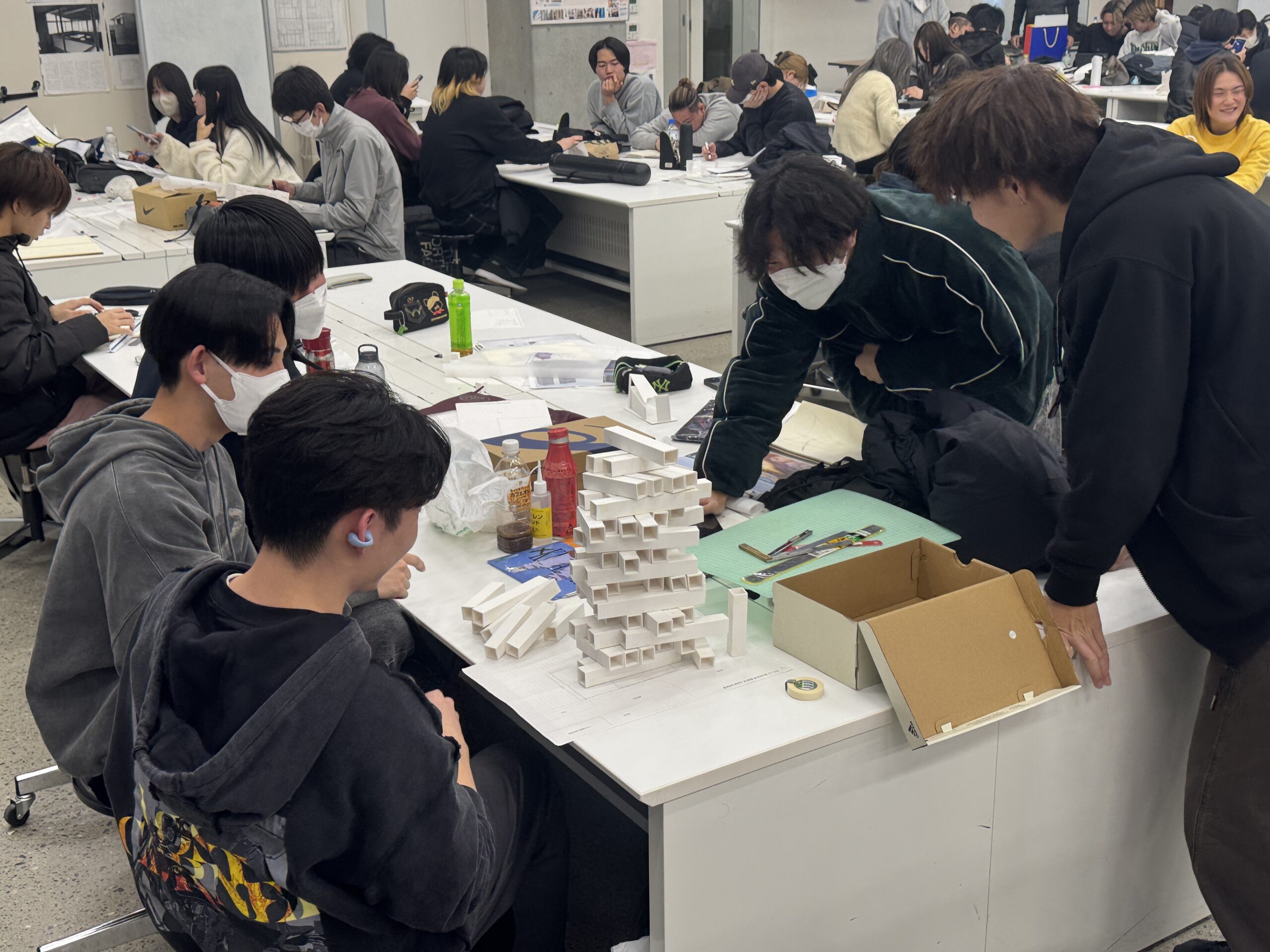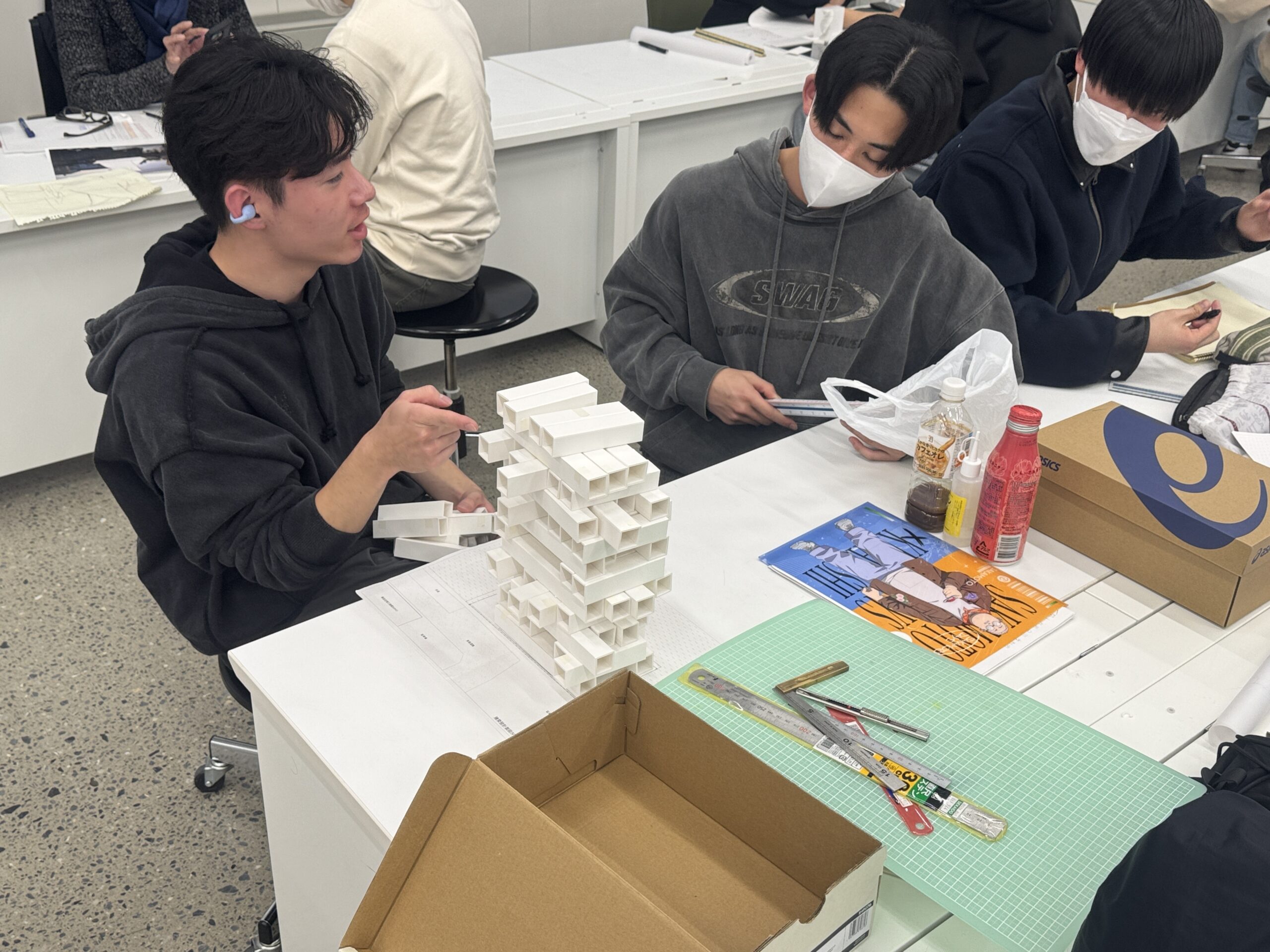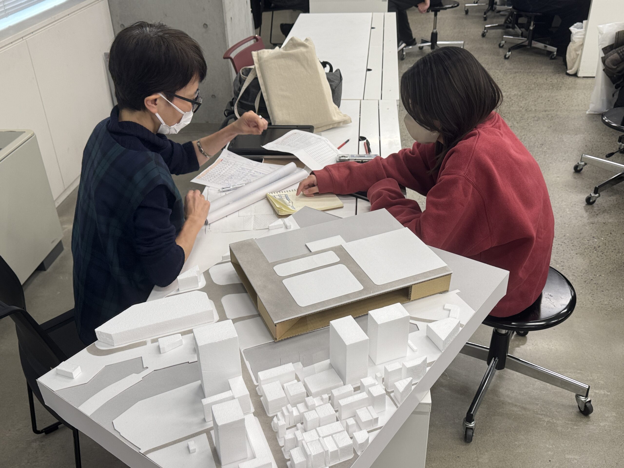 観光センターとして象徴的な外観デザインが求められますが、ファサードデザインに苦戦する学生が多く見受けられました。先行事例を参考にしつつも、「みなとみらいの象徴」となるような、自身が考える新たなランドスケープを担う外観を大胆に計画してほしいと思います。スタディ模型が増えてきたことで学生同士でのエスキスも多く見受けられました。活発な議論は、自身の思考を深める重要なプロセスです。次回は中間発表となるため、さらにスケールアップした模型が出てくることを期待します!