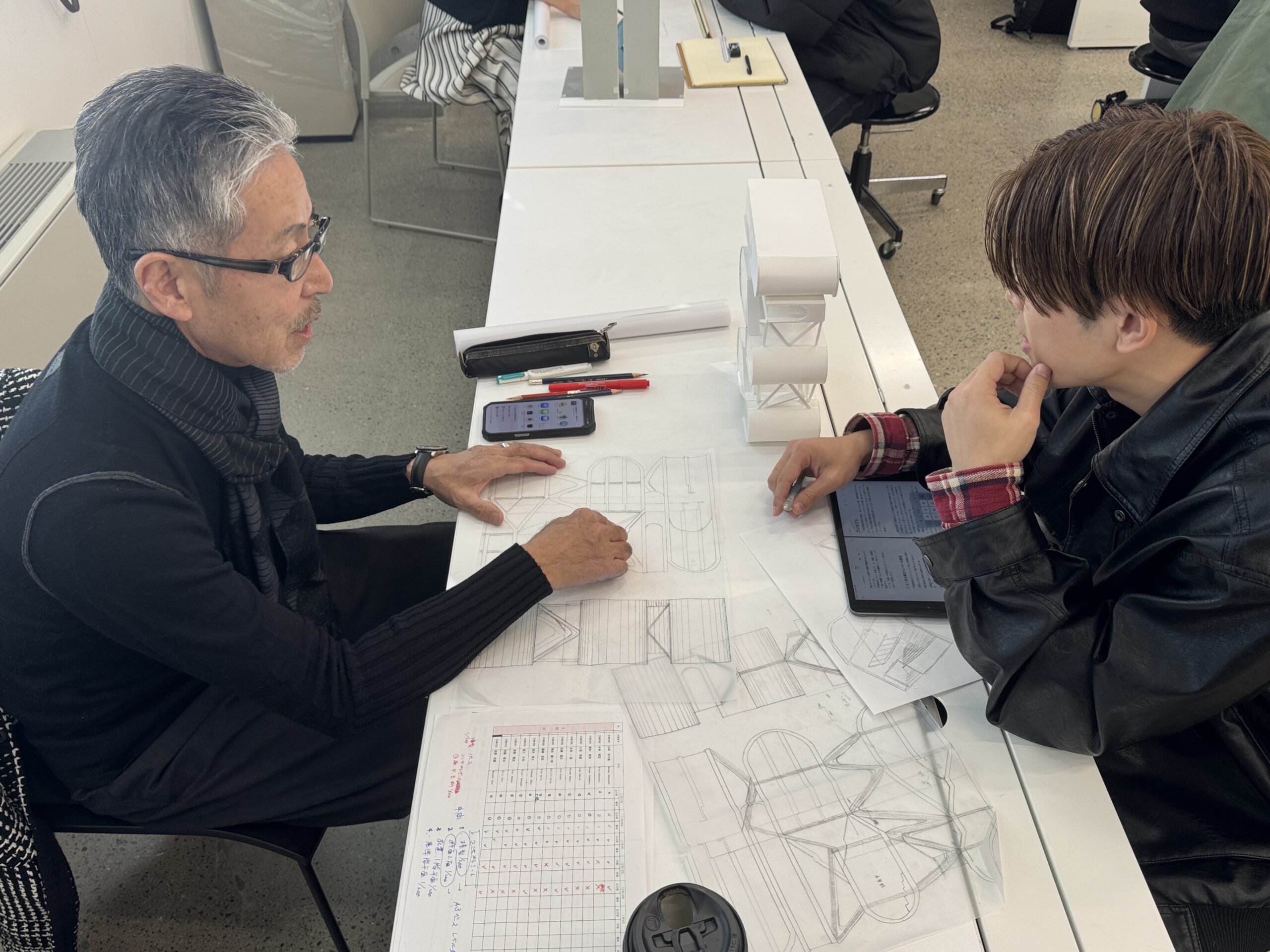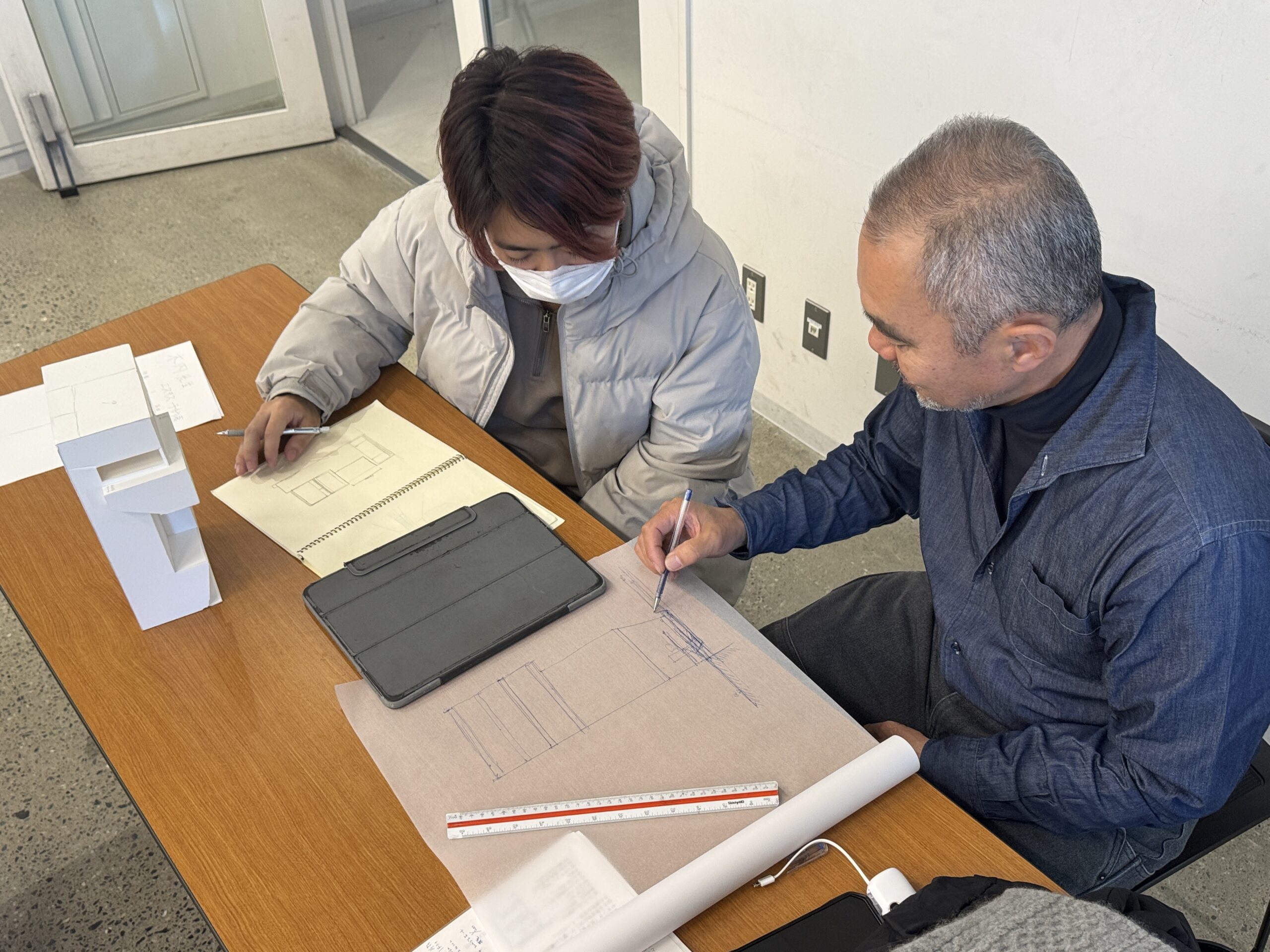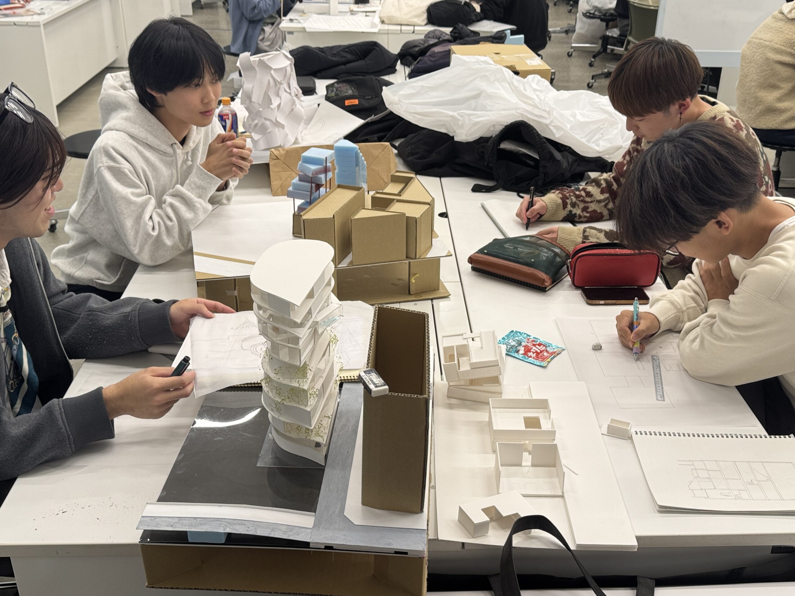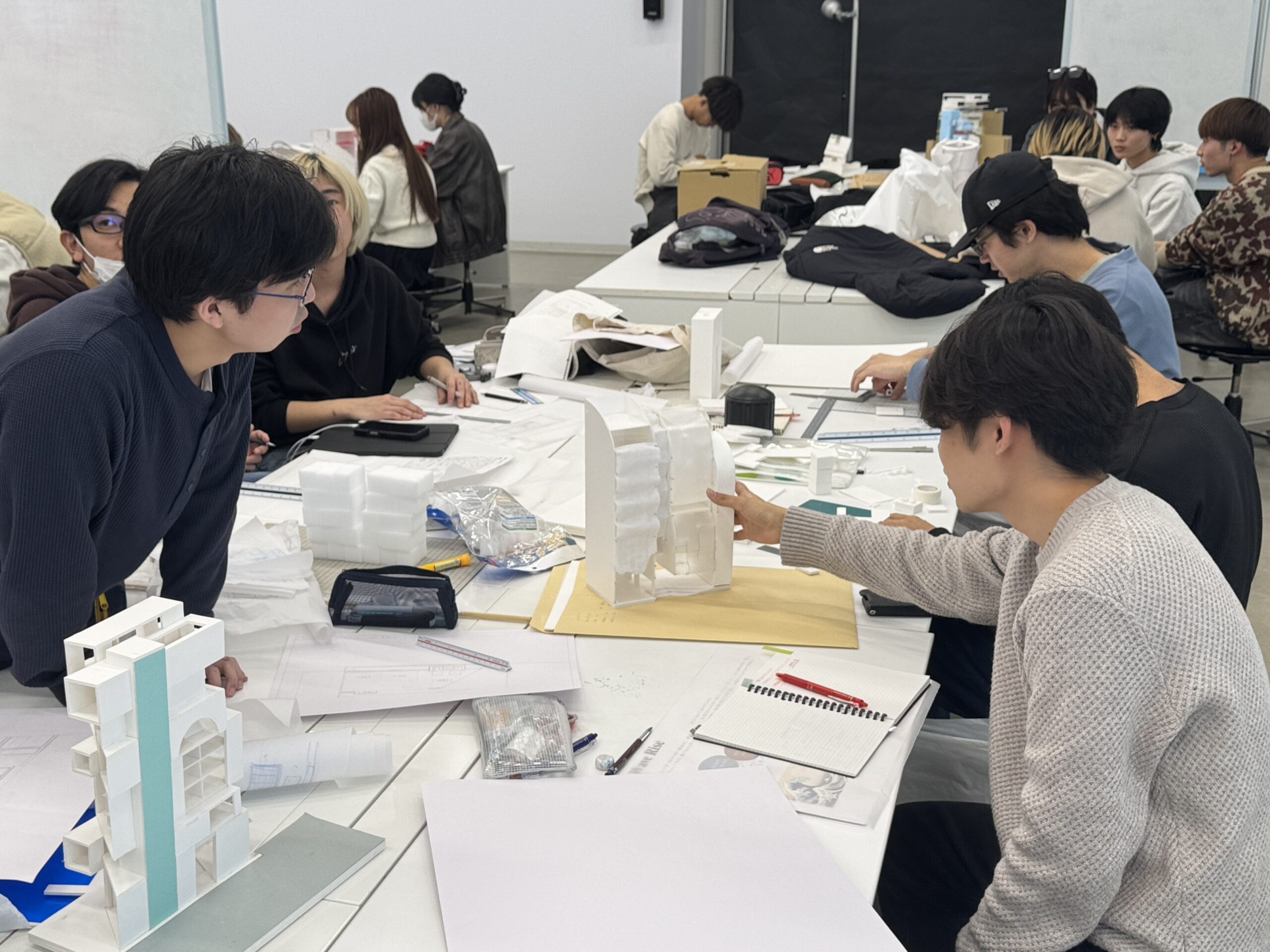 模型や図面を一度形にしたことで最終提出に向けての課題やビジョンがより鮮明に見えてきました。大きくわかりやすい模型はエスキスでは非常に重要です。議論が進むにつれ学生同士での自発的なエスキスも盛んに行われています。