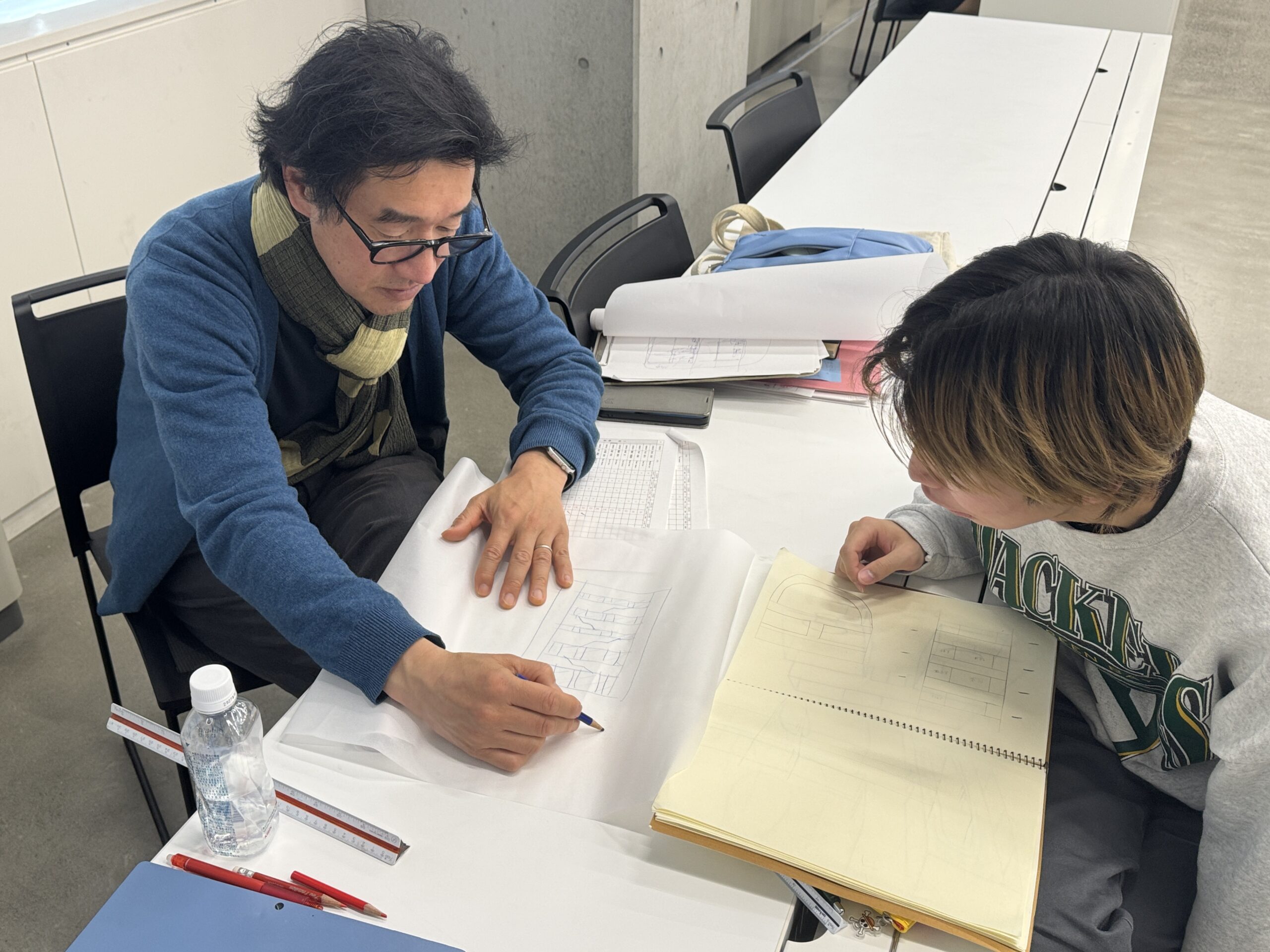 中間発表を終え、各自が作成した図面、模型をもとに、最終提出に向けたまとめ方や細かい修正点の確認が行われました。今回のエスキスでは構造についての課題が多く見られ、木内講師のアドバイスを熱心に仰ぐ学生が多く見受けられました。提案したいデザインのためにも、構造の表現は欠かせません。