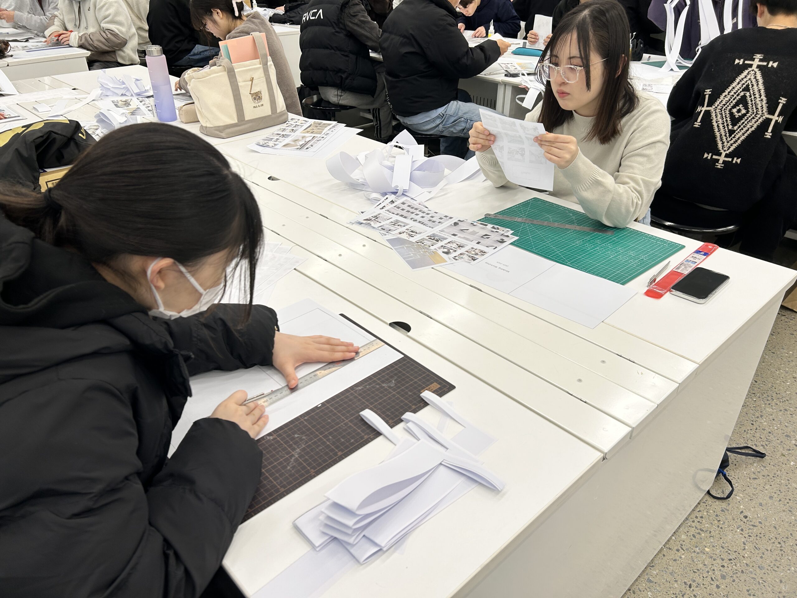 まずはブックレットの製本をしました。今までの学生の作品を掲載した半年間の作品集です。事前にTAが作成したポートフォリオです。第1回目からの作品が掲載されているので、ポートフォリオを見るとこれまでの自分達の成長を実感できると思います。