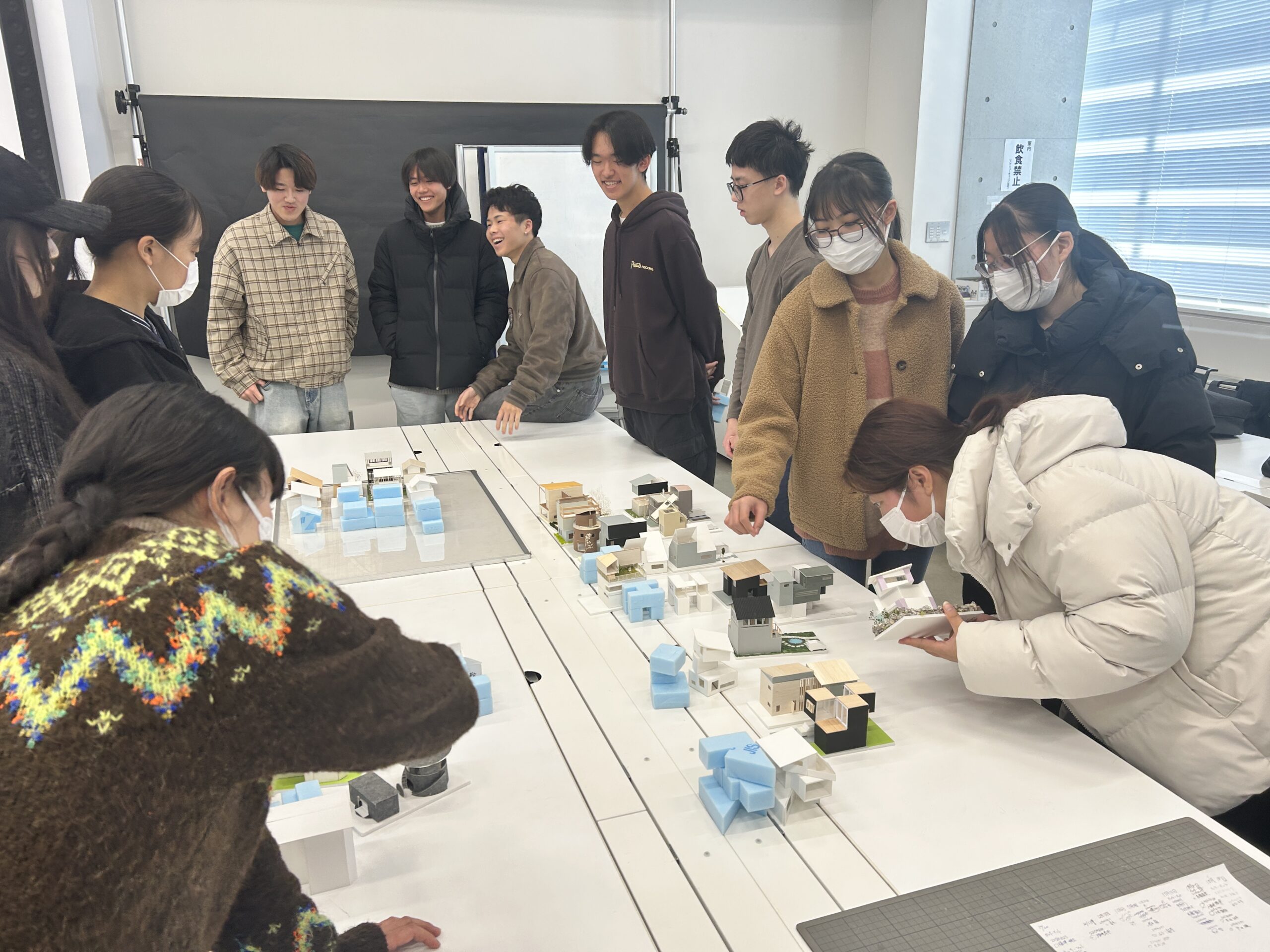 最後に前回までの一戸建て住宅の作品を机に展示し、学生それぞれの作品を全員で鑑賞しました。同じテーマで条件でも全く異なる作品。デザインの第一歩を踏み出すことができました。