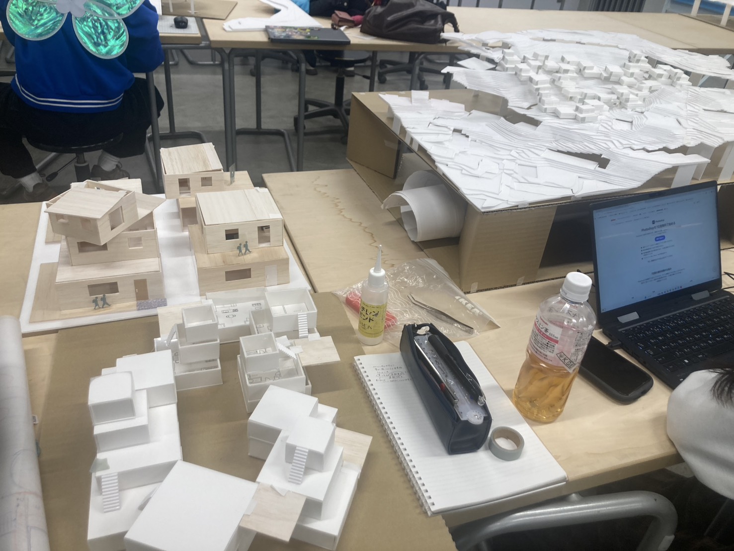 全体の様子として、スタディのために模型や図面など数パターン作り、手を動かしている学生が多くいる印象でした。スタディは形を決めるために行うものですが、その形になった経緯やその形から生まれる空間を書いておくことで、最終発表のボードの材料にもなります。考えたことは、すべて、文字やダイアグラムにして、図面や模型とともに追記することが大切です。