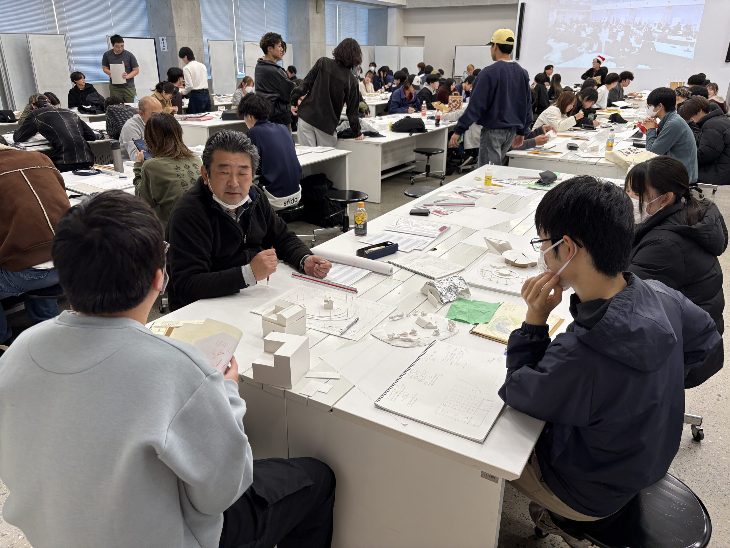 班に分かれて製図作業が始まると、毎回の課題になっているスケッチの講評会が行われました。各班で発表している人が増えている事が目立ち、スケッチ課題の内容が上達している事が分かります。ですがまだまだ図面やダイアグラム、リサーチが足りない人も少々います。次回は模型提出があるためスケッチ課題はありませんが、ぜひ引き続き課題を続けてレイアウトやリサーチ内容を深めてみて、プレゼン力を上げましょう!