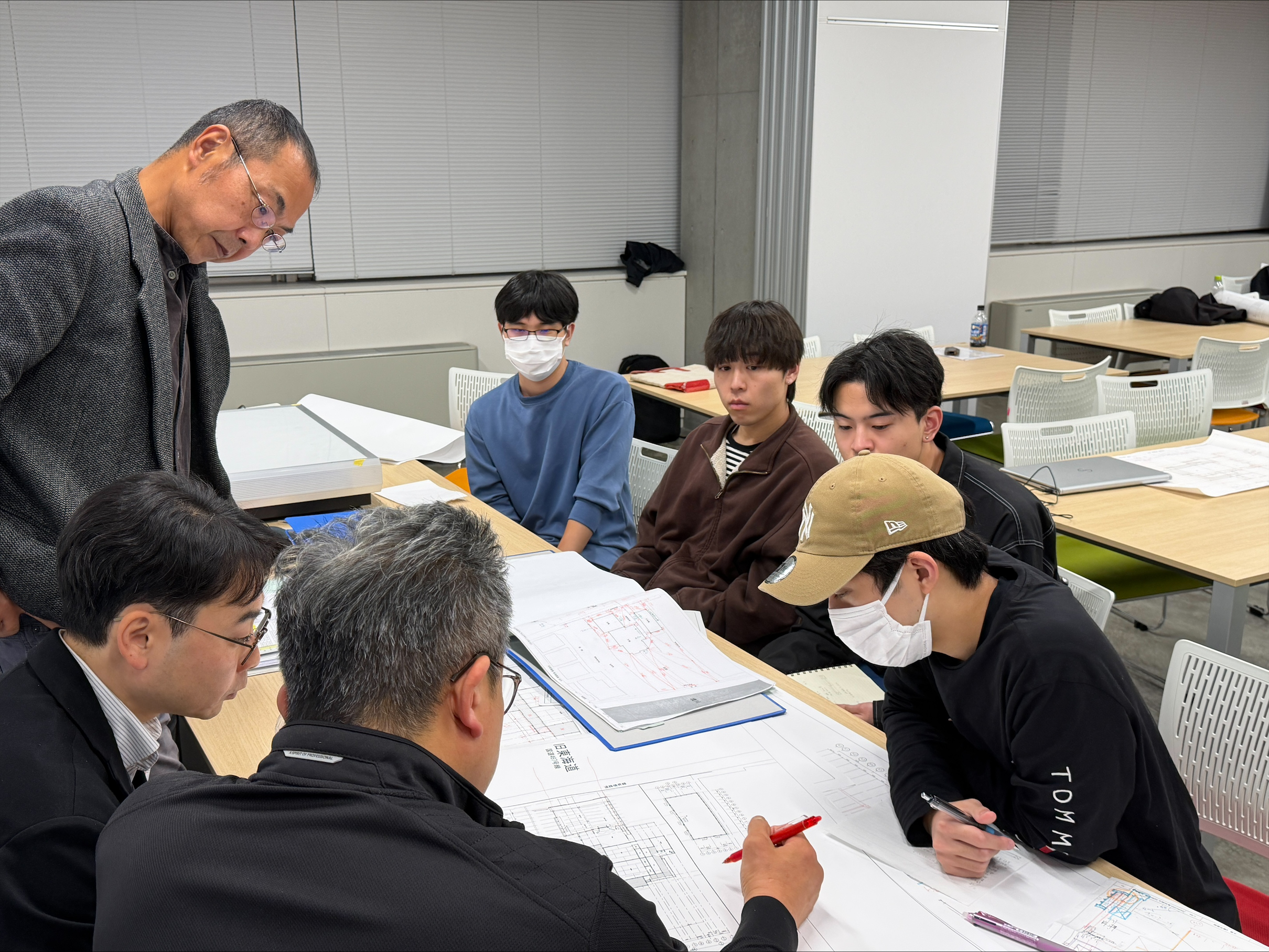 その後は幸保邸の実測図面の確認をしました。平面図・立面図・断面図のすべての図面を先生方と学生が一緒に確認を行い、修正箇所を共有しました。少しずつですが着実に完成に近づいています。平面図の描き方例もmanabaに挙がっていますので、ぜひ参考にして完成させてください!