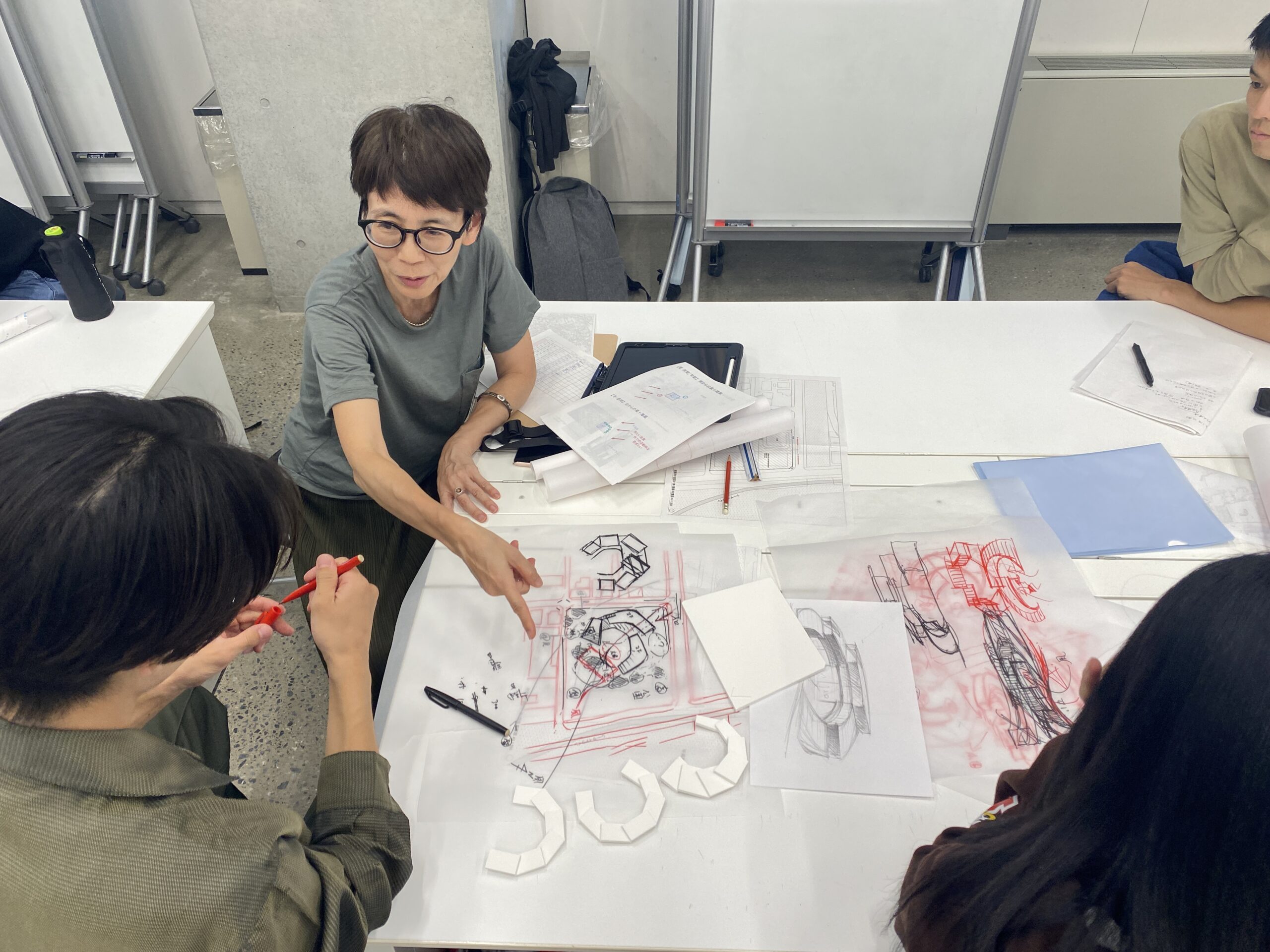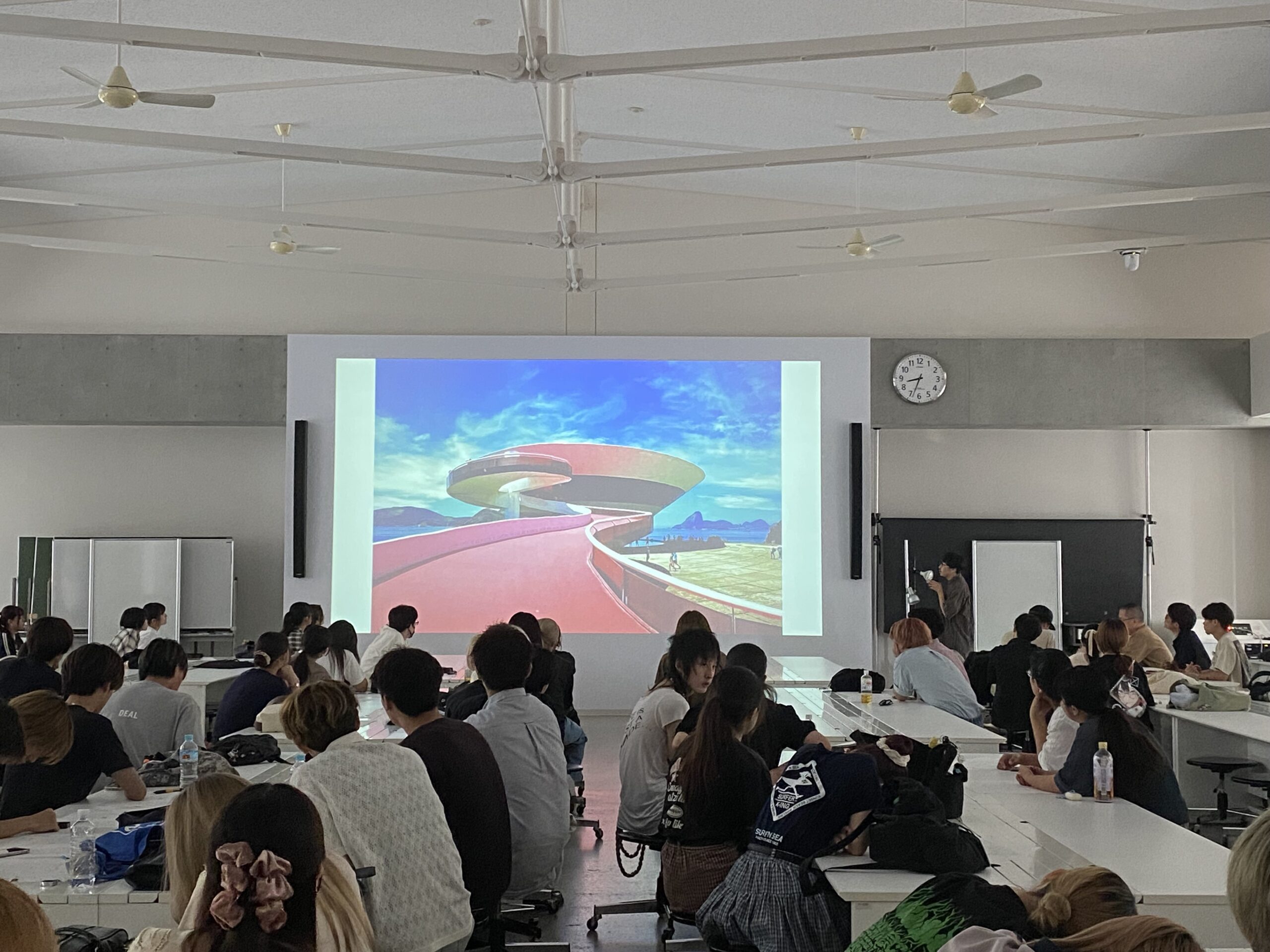 課題説明後は講義を担当してくださる先生方からレクチャーをしていただきました。先生方が普段どのような作品やプロジェクトを行っているのか、学生たちの興味津々な姿が見られました。レクチャーの中で井上玄先生から「感覚的なものを建築言語に置き換えられるようになろう!」と大事なアドバイスをいただきました。