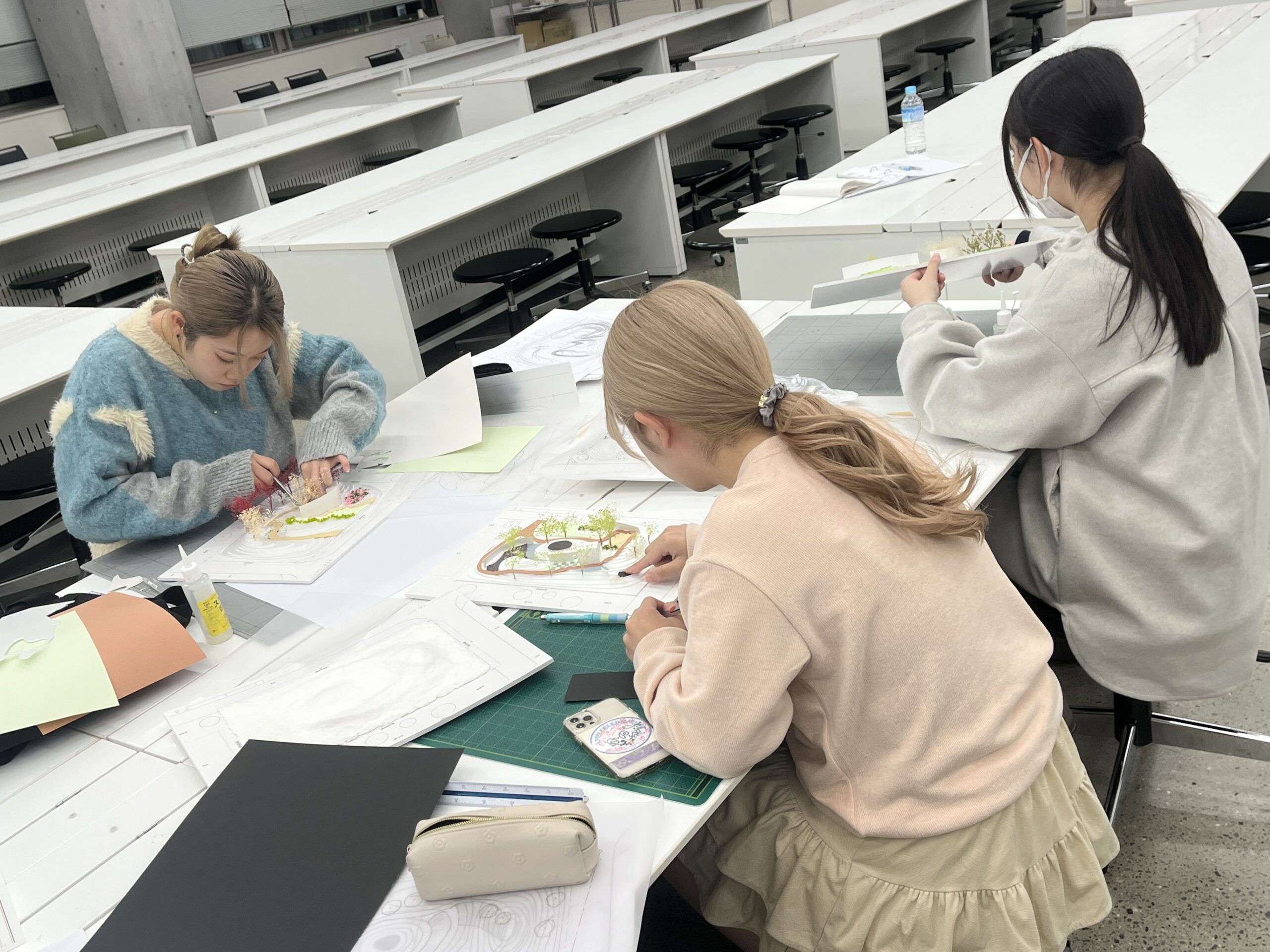 図面が完成した学生は、コンタ模型をつくり始めました。描いた図面を印刷しスチレンペーパーに貼り付け、等高線に沿って切り出し積み上げていきます。非常に細かい作業でしたが、どの学生も集中力を切らさず黙々と作業を進めていました。
