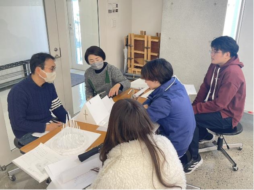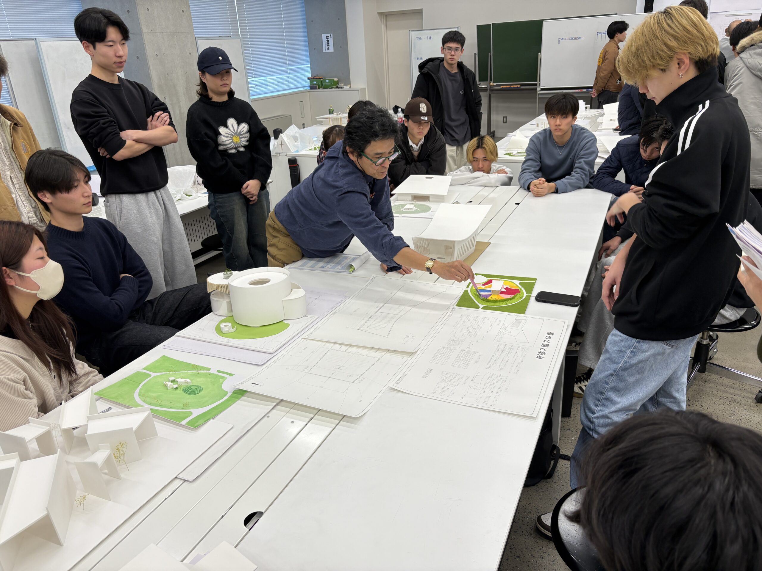 課題説明の後は各班に分かれてミーティングを行いました。それぞれの班で、これからの授業に向けての予習、復習など授業のための準備をしっかりとやってくること。授業時には先生とのエスキスを有意義に過ごせるようにと先生方からのお言葉がありました。