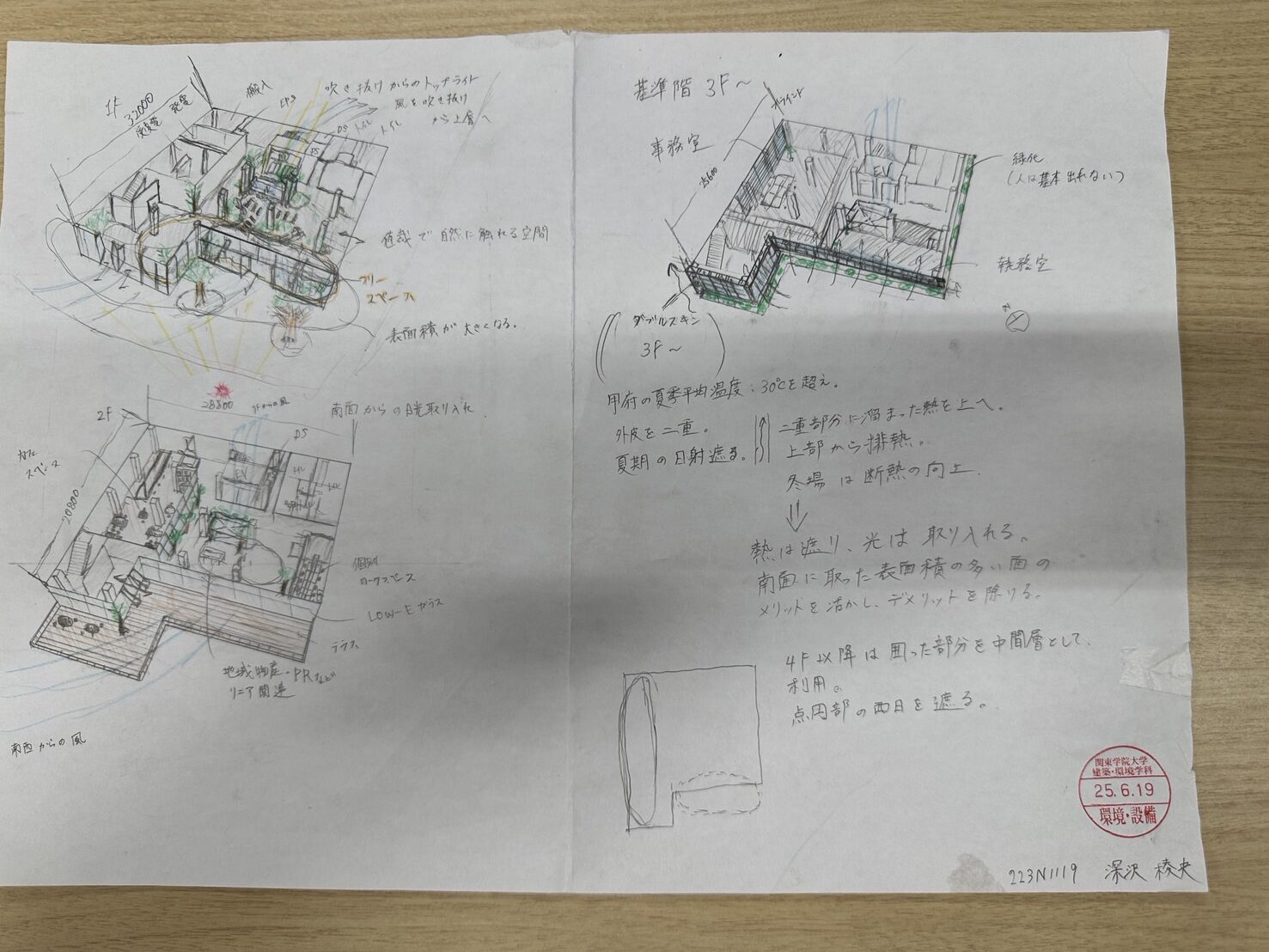 今回の課題は、各室の用途や対象者に応じた室内環境のスケッチでした。スケッチで室内空間に空気、光環境を取り入れ、想定する温熱環境を創造するためのパッシブ要素とアクティブ要素を組み合わせたオフィス空間の室内環境について具体的なイメージと環境的アプローチが出来ていました。